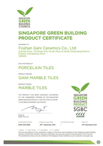 大理石瓷砖作为绿色可持续材料,绿色理念同样扎根于产品生产及管理过程。至今,简一已获得众多国际专业平台的绿色认证,包括HKGBC绿材环评铂金证书,美国绿色建筑委员会认证成员,并在9月份成功获得新加坡绿色建筑产品最高认证级别(领袖级别),继世界顶级品牌Fiandre, Florim后第三个瓷砖品牌、首个中国品牌获此殊荣,再次印证简一对环保、可持续发展的行动和成就等。
