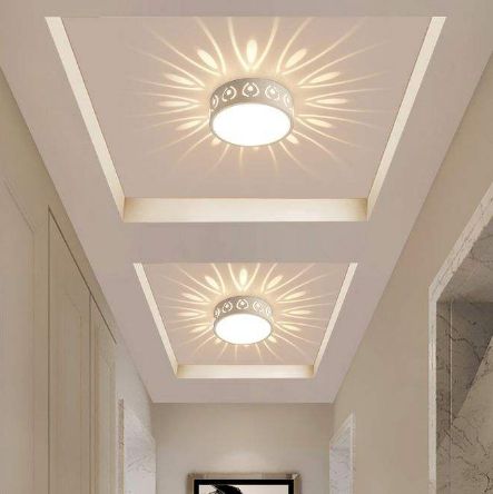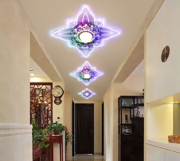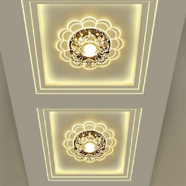 现代简约LED水晶嵌入式过道灯也可用于走廊,玄关,阳台等等。这款过道灯非常简约大气,高端,方形叠集吊顶安装了一盏弧形花瓣式水晶灯,在灯具的烘托下,整个空间质感显得非常大气,彰显出了主人的高贵气质。