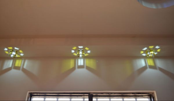 三盏玻璃水晶灯,菱形灯底搭配上圆形的玻璃水晶灯,这种属于长的过道,整个设计看起来非常美观,简洁而又清新,让你回家走过一段温馨的路。
