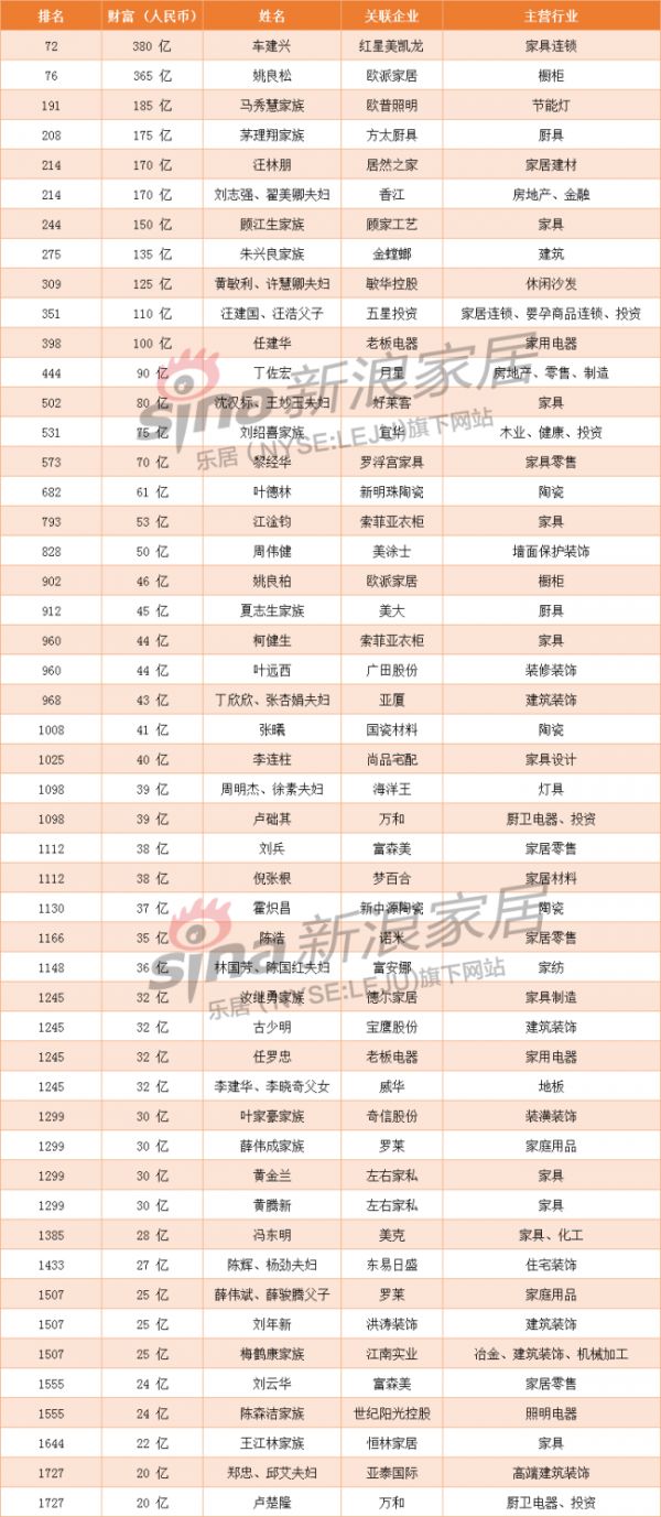 新浪家居整理了与家居相关的家具、橱柜、家用电器、家纺、装饰等多个领域的财富名单,其中,约有50人(或家族)跻身榜单之中。排名前100名的上榜门槛是300亿元,家居行业唯红星美凯龙董事长车建兴和欧派家居董事长姚良松2人;排名前1000名的有23人(或家族),身家43亿元起。