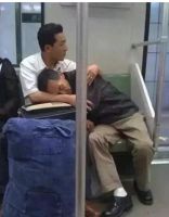 地铁上,疲乏的老父亲在儿子怀中安稳地睡着了。看多了父母搂着孩子,但看到搂着老父亲睡觉的,还是第一次。