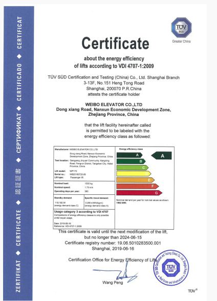 此次,获得南德TÜV能效A级认证的是我司WP175系列的乘客电梯。测试的样梯是载重1000kg、速度1.75m/s的高层乘客电梯,经由南德认证检测(中国)有限公司上海分公司检测认证,并通过《VDI 4707-1》标准。表明我司顺应环保、高效的电梯发展趋势,体现了韦伯电梯对社会可持续性发展作出的承诺。