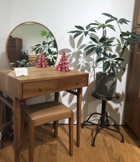 在卧室中,放上一个木质的梳妆台,让整个空间充满古朴的气息,再在梳妆台上面设置一面圆形的镜子,营造“花好月圆”的氛围,呈现美好寓意。