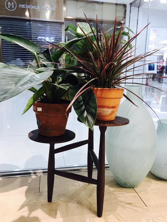 除此以外,还有木质花盆架,高低不同的设置,让视觉产生变化。在上面摆放绿色的盆栽,不仅吸睛,也装饰了空间。