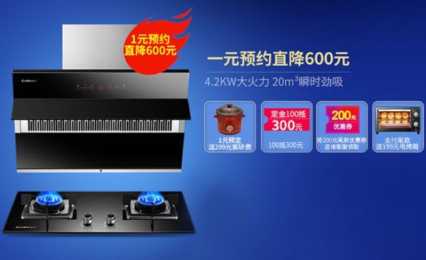 另外,康宝还推出了一套非常实惠的烟灶套餐BE88+508,该套餐平日销售价为2599元,现在1元预订将享受非常实惠的价格,双11期间直降600元,还可以获赠价值299元的紫砂煲一台,最终到手价仅需1999元,由此可见该套餐的优惠力度非常大。相当于1999元便可购得油烟机、燃气灶、紫砂煲三件套。