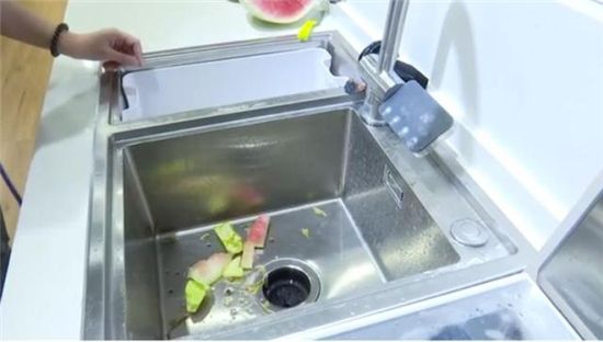 此外,随着垃圾分类的逐步推行,餐厨垃圾是不少家庭头疼的问题,现在多功能水槽可以解决一切问题。下图就是一个多功能水槽,它不仅具备水槽的功能,还有一个洗碗的功能,最重要的是它还有垃圾处理的功能,我们只要打开冷水,再打开开关,就可以听到机器启动声音。把一些西瓜皮、茶叶往下面扔,我们可以听到粉碎处理的声音。粉碎了之后,它会自行处理,之后直接随着污水管道排出去。这样,可以很好地解决我们餐厨垃圾分类的问题。