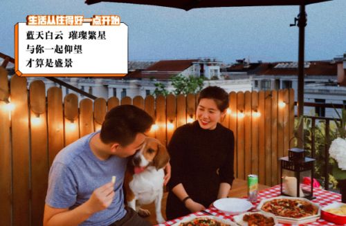 当夜幕将临时,露台上装饰的星星闪闪的小黄灯也会亮起来,气氛温馨催人醉。夫妻俩一起吹着晚风,吃着披萨,喝着啤酒,无比惬意。