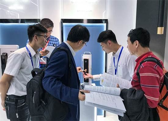 在智能锁区域,推拉式、滑盖式和直板式等各种款式,应有尽有。其中,天生名品,大气自成的顶固TX智能锁,一体化高硬度的3D曲面屏在灯光的照射下星光璀璨,FPC半导体指纹传感器和cortex系列芯片的安全性能给观众满满的踏实感!
