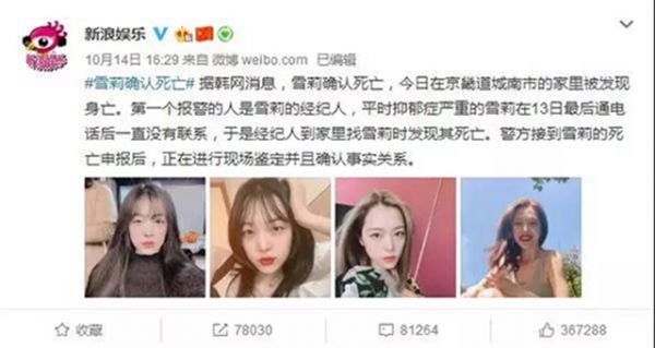 10月14日,25岁的韩国女明星崔雪莉,被证实在家中自杀。