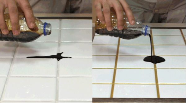 用酱油和辣酱分别涂在两块瓷砖缝上,填了雨虹靓缝剂的瓷砖缝隙,轻松擦净,超易清洁;填了普通美缝剂的瓷砖缝隙,擦洗后仍有污渍残留。