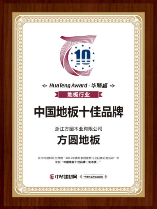 中规中矩,逐成方圆。在接近三个月的竞逐当中,方圆地板在“中华建材网”主办的2019华腾杯中国地板十大品牌评选活动中,不负众望地斩获了“中国地板十佳品牌(实木类)”这一奖项。此次的评选活动是由网络投票、十大专业评审以及组委会定向考评三项综合评定,这次方圆地板获得这个重大奖项无疑证明方圆地板的产品质量以及服务周到受到了社会各界的高度评价。