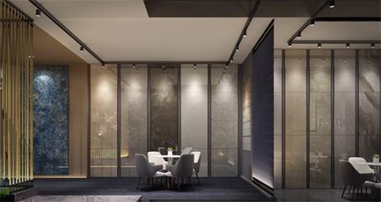 本次展馆的设计在大面积黑白灰的基础上,用明亮活泼的色彩加以点缀,点亮整个空间,尽显活力。瓷艺画的使用,给予空间浓厚的艺术气息。