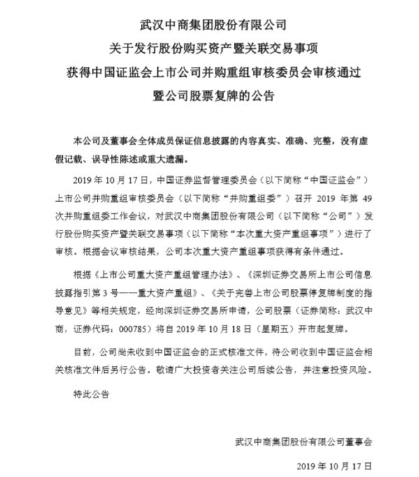 经历九个月,至上周六(10月12日),证监会并购重组委2019年第49次工作会议发布公告,上市公司并购重组审核委员会定于2019年10月17日上午9:00召开2019年第49次并购重组委工作会议,审核的并购重组申请人为“武汉中商集团股份有限公司(发行股份购买资产)”。