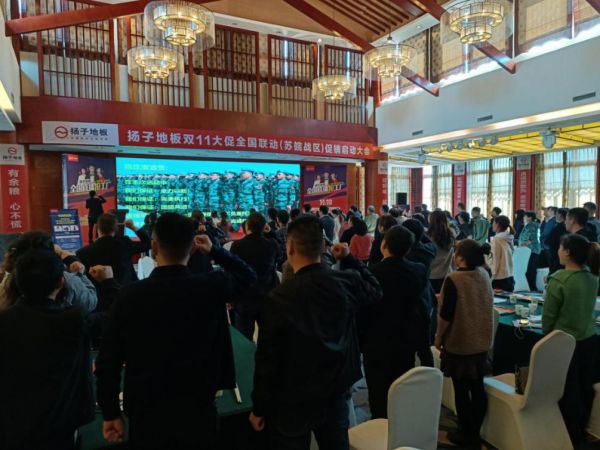 10月15日扬子地板双十一大促全国联动(苏皖战区)启动大会第一站在扬子地板总部盛大开启,苏皖战区的各位销售精英以饱满的热情和必胜的信心参加了此次会议,蓄势待发,迎战双十一!