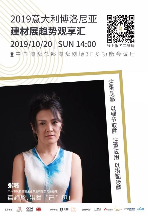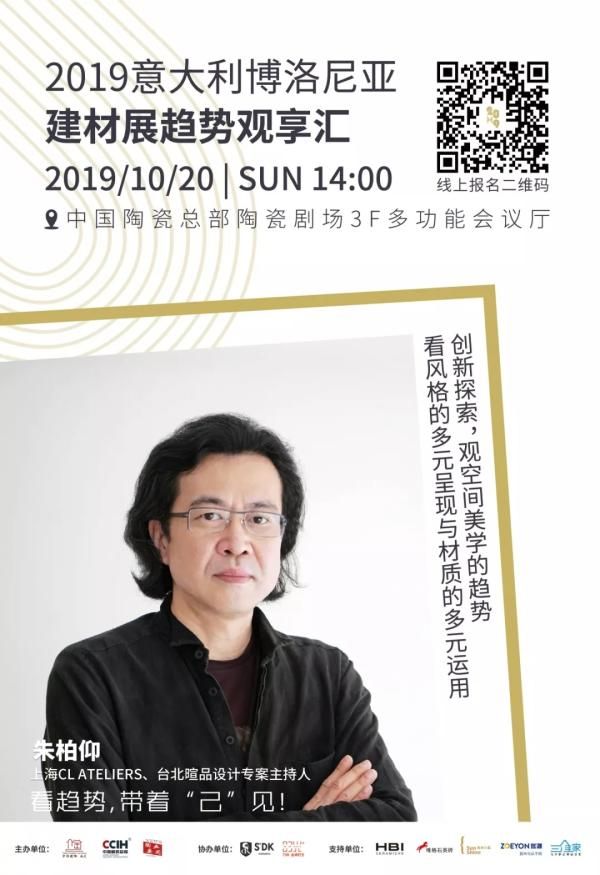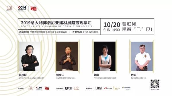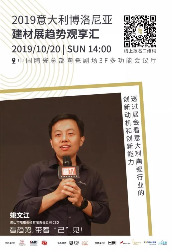 2019意大利博洛尼亚建材展趋势观享汇邀请了上海CL ATELIERS 、台北暄品设计专案主持人朱柏仰,佛山市唯格瓷砖有限责任公司 CEO姚文江,广州市风和日丽企业策划有限公司总经理张璐,佛山市陶瓷行业协会秘书长尹虹四位重量级嘉宾,从不同角度发掘博洛尼亚展上的潮流趋势,并面向行业进行多角度权威性的趋势分享。