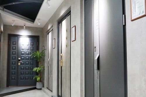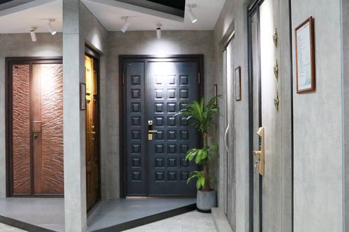 还未进店,一眼望去的灰便与与其他五颜六色的展位形成了鲜明的对比。处理妥当的水泥墙面,保留着混凝土建筑本身具有的自然的颜色和机理,外观朴素,反而更显高雅、自然。一个个富有特色的装甲门整齐排列,仿佛静待人驻足、开启……