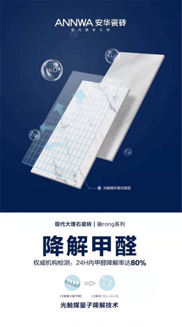 安华瓷砖利用了“光触媒量子降解技术”研发出环保、健康、有效的“融”系列大理石瓷砖。融系列不仅将东方美学元素融入到瓷砖里,更是将这一项环保高新技术融入在内,24小时内降解甲醛率超80%。