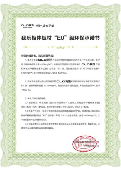 同时,我乐家居还会向消费者提供一份“E0”级环保承诺书,让大家能够放心使用,不用为甲醛问题而担忧。