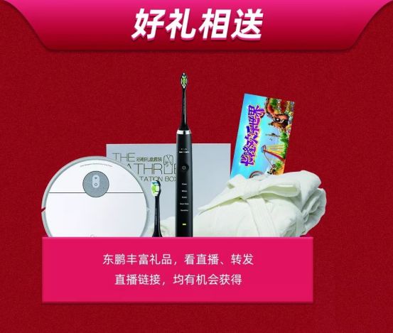 直播期间,将在直播间发出万元红包免费抢,先到先得,抢完即止!同时,直播间还设有抽取奖品环节,观看直播的鹏友均可参与!加湿器、电动牙刷……精致生活,你我共享。
