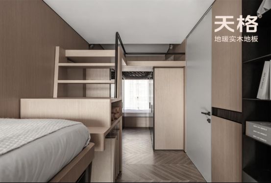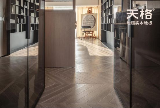 本期委托人居住在深圳,夏季高温潮湿且多雷雨台风,当雨季来临时,地面、墙面返潮现象尤为严重。天格地暖实木地板,采用六面涂装工艺,具有极高的耐湿稳定性能,不仅防潮,还有耐磨耐刮擦的功能,日常无须特别养护,可以为用户减少大量烦恼,节省大量宝贵的闲暇时间,仅此一项,就能让生活的幸福感得到极大的提升。而这,也是设计师大面积选择天格产品作为地材的又一重要原因。