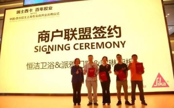 开业现场,西卡携手恒洁卫浴 、派雅门窗、欧琳橱柜举行联盟签约仪式。聚智凝力,协力共赢,只为更好地满足广大用户对美好生活的向往,共同打造环保贴心的家居生活。