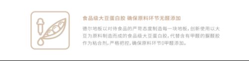 德尔作为地板行业中的领导者,产品以环保著称,经过三年潜心研发,终于在2013年正式推出一款达到极致环保的地板新产品——德尔无醛添加地板。该款地板全新启用食用级大豆胶,打造真正无醛添加的环保地板,让家人生活的每一步都健康、放心。