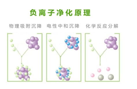空气中的负离子与细菌结合后,使细菌产生结构的改变或能量的转移,导致细菌失去活性。高浓度的负离子可以让周围环境内的细菌迅速死亡,同时负离子还能与空气中的尘埃结合沉淀,冲刷后就能达到除尘的目的。