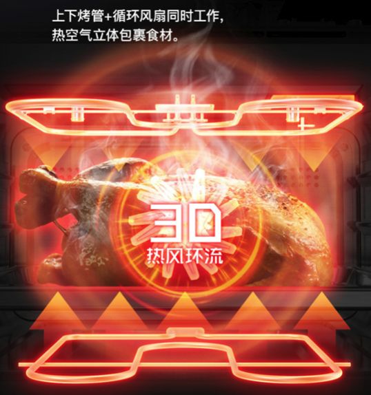 2、纯烤,媲美于专业烤箱,上下精准调控腔内温度,根据菜式选择多种模式。3D热风环流技术,上下烤管和循环风扇同时工作,使得腔内热空气立体包裹食材;智能控温系统,保证食材受热均匀,火候恰到好处。