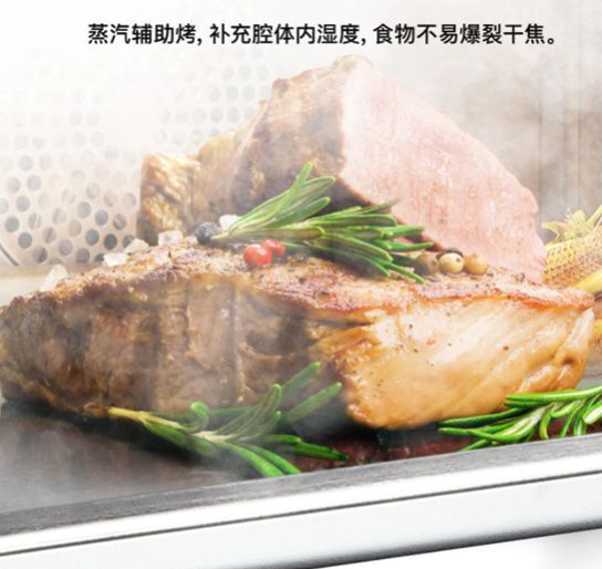 3、蒸汽烤,蒸汽与高温炙烤相结合的鲜嫩“水浴烤”模式,脱脂减盐烹饪出更佳口感。蒸汽辅助烤技术,补充食材内部湿度,不易爆裂干焦,菜式外焦里嫩好味道。