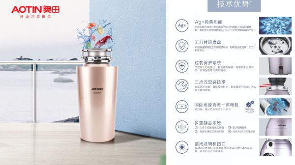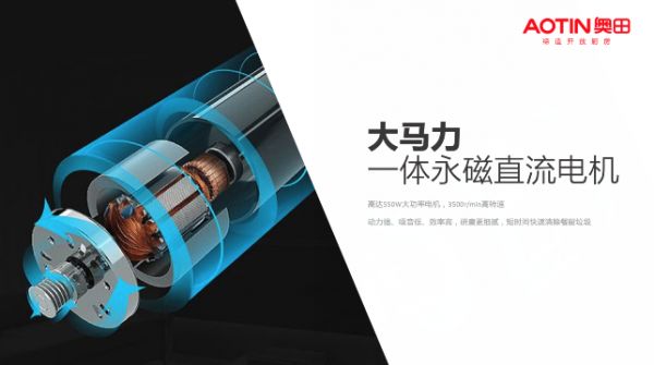 例如,AOTIN奥田垃圾处理采用大马力一体永磁直流电机,高达550W大功率电机,3500r/min高转速,动力强,噪音低,效率高,研磨更细腻,短时间清除餐厨垃圾。