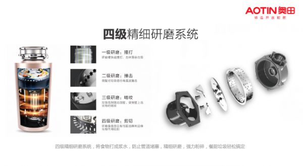 研磨仓的设计决定着研磨垃圾的最终效果,AOTIN奥田垃圾处理器,采用四级精细研磨系统!将食物打成浆水,防止管道堵塞,精细研磨,强力粉碎,餐厨垃圾轻松搞定!