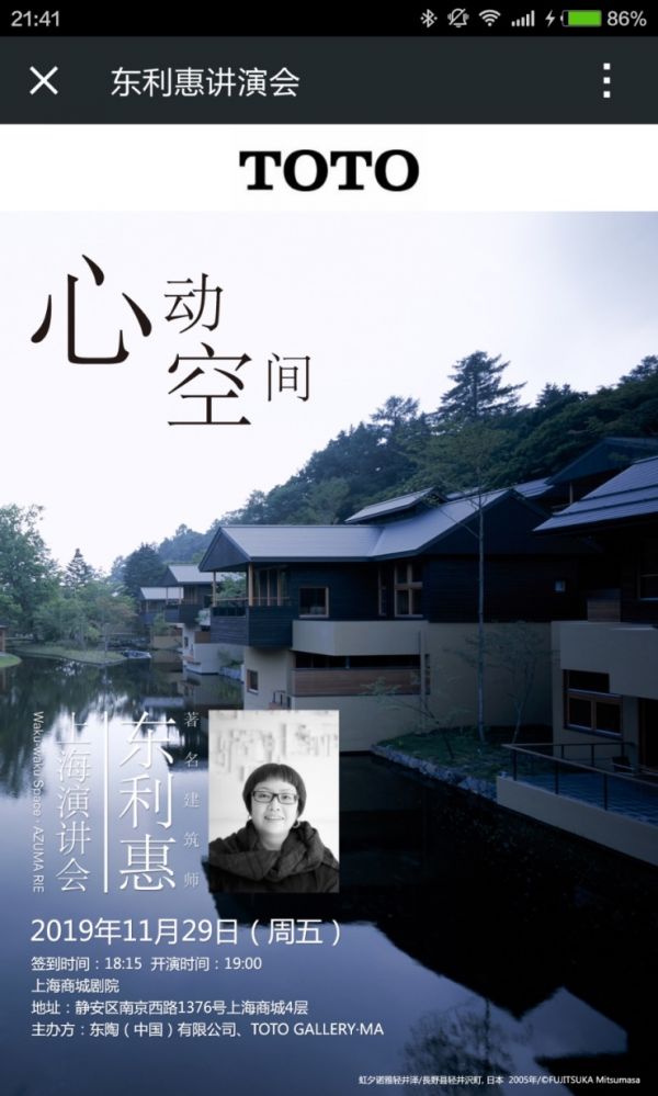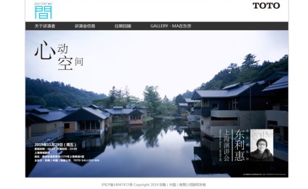 即日起,点击链接https://www.toto.com.cn/gallery/pc/infor.html进入【预登记系统】报名,将有机会免费获得大师讲演讲会的入场资格!(本次报名仅为预登记,我们将会在11月22日前通过短信/邮件方式发送最终确认函。如有疑问,可关注【TOTO东陶(中国)】官方微信公众号在后台留言咨询。