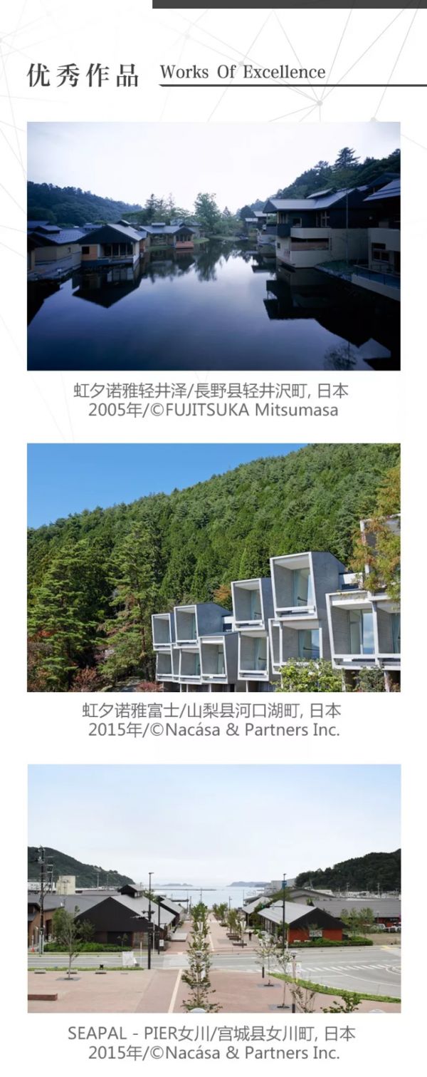 “Hotel Bleston Court”第一期~第七期(1995~2005)、“虹夕诺雅轻井泽”(2005)、”虹夕诺雅京都”(2009)、“Hotel Bleston CourtYUKAWATAN”(2011)、“虹夕诺雅竹富岛”(2012)、”虹夕诺雅富士”(2015)、“ SEAPAL - PIER女川(2015~2016)、虹夕诺雅东京”(2016)、”虹夕诺雅巴厘”(2017)等。