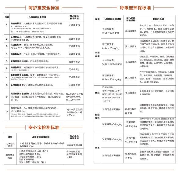 成年人家具标准不适用于儿童家具标准,儿童家具有自己的安全标准,《儿童家具通用技术条件》作为我国首部儿童家具强制性国家标准,该标准重点对3岁至14岁儿童使用的家具产品制订了强制性要求,包括安全要求、警示标识、试验方法以及检验规则等多项内容,从碰撞、挤压、密闭、倾倒、滑落、缠绕、污染和燃烧等方面最大度的对儿童进行安全保护。作为唯一参与起草《儿童家具通用技术条件》的儿童家具品牌,七彩人生工作人员表示,儿童家具不同于“缩小版”儿童家具,儿童家具标准也比成年人家具标准更为严格,如在重金属方面,儿童家具标准对包括甲醛、可溶性重金属在内的10种有毒有害物质的控制做出了严格限制,比成年人家具多出砷、锑、钡、硒四种重金属的限量,家长在选购和使用儿童家具时最好以“国标”作为参考。