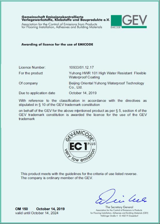 通过国家生活饮用水输配水设备及防护材料的安全性评价标准和德国EC1plus环保认证,安全环保,产品近乎无味,可应用于饮水池防水。