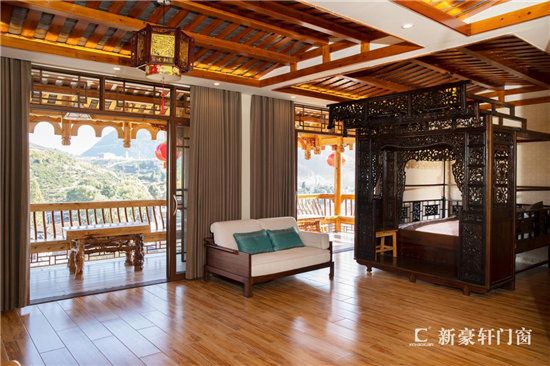 整栋民宿共设一个接待大厅和43间客房,客房与阳台之间隔断采用的新豪轩推拉门,价值大约45万元。