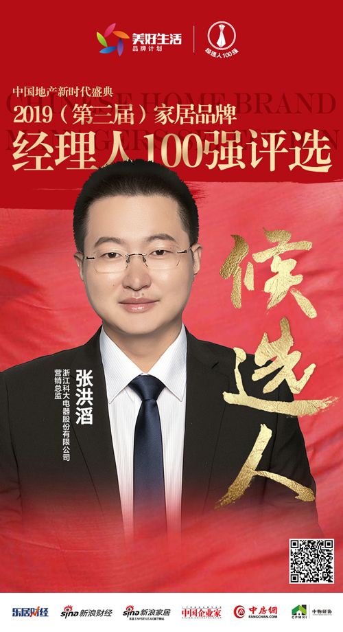 新浪家居讯 由乐居财经、新浪财经、新浪家居、中国企业家、中房网联合主办,中国房地产业协会、中国物业管理协会、全国工商联家具装饰业商会共同指导的“家国同梦——2019年(第三届)中国家居经理人评选”活动正式启动。浙江科大电器股份有限公司营销总监张洪滔获媒体提名,进入“2019中国家居品牌经理人100强”评选。