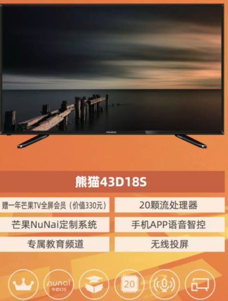 吸引年轻人回归电视,首先需要电视中有他们喜欢的内容。为此,熊猫电视联合中国五大视频平台之一的芒果TV联合打造熊猫芒果系列电视,以爆款熊猫43D18S为代表,尺寸覆盖39英寸、32英寸,满足不同的住户需求。