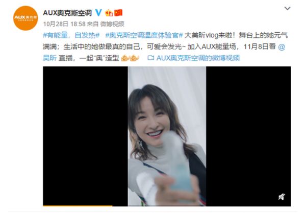 从这个意义上来讲,让吴昕来担任奥克斯空调温度体验官可以说是非常契合的。正如Vlog中吴昕所说,让身上散发的热量去温暖其他人,就像视频背景中的那台奥克斯空调,为大家带来舒适和温暖。