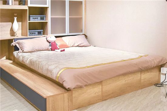 拥有它,等于同时拥有了一间书房+客房+休闲室+储物间。量身打造的壁柜,适合摆放大量的书籍,书架下面还贴心设置了书桌,可偶尔在家办公或留给孩子写作业。榻榻米隐藏了个可升降的桌子,需要时将它升起,可化身一张桌子,约上三五知己小酌;而把桌子放下来,在榻榻米铺上床单放上枕头,就可化身为一张双人床,为家里多添一间卧室。