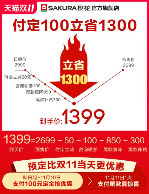 作为双11的爆款产品,当然不能止步于“性能”出色,价格也是消费者看中的重点。JSQ28-C热水器不负众望,平时卖2999双11只卖1399,立省1300元!小编带你算一笔帐:在原价基础上,预付定金(减50)+咨询领劵(减100)+尾款直降(减850)+尾款补贴(减300)。直降到1399,5折轻松拿下。