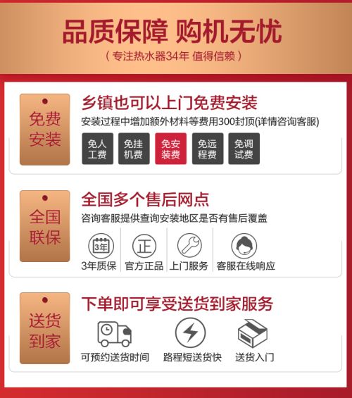 物好价又低,还有豪礼送不停,“性价比”之王的称号非它莫属。当然,作为“大件”电器,安装与售后必须完善,尤其在快递繁忙的双11。为此,樱花热水器保证:免费安装。乡镇家庭也可以享受上门免费安装,人工费、挂机费、安装费、远程费、调试费5项费用全部为“0”。亦可预约送货时间,下单即可享受送货到家服务。