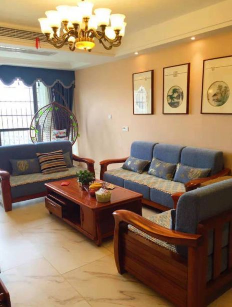 客厅带给人的第一视觉感受就是恬静、淡雅,新中式风格,保留了传统中式的典雅气韵,又增添了一丝恬淡时尚的惊喜。蓝色布艺安静儒雅,带着现代的时尚气质;实木框架柔和圆润的设计,摆脱了实木的厚重严肃,加上莹润柔和的木色,优雅了居室空间,