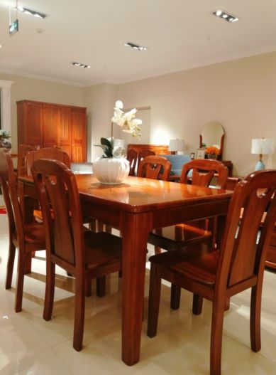 餐厅装饰以简单舒适为主,实木餐桌椅带有自然温润的美感,在一统国际家居简约的造型设计以及柔和色调的映衬下,显得尤为突出。搭配几个中式元素的软装饰品,朴素的空间也别具中式的优雅格调。