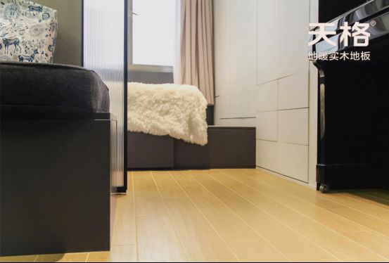 首先是安全性上必须消除卫生间的高低差,因为无法完全降低卫生间的高度,最终采用全屋增高的方法消除高低差。这样,为了给房子留出充分的层高,设计师选择了采用“虎口榫”锁扣技术、免钉免胶免龙骨安装的天格地暖实木地板。这种悬浮式铺装比普通实木地板的龙骨安装至少节省4-5厘米的高度。所以,在商品房层高普遍不高的情况下,天格地暖实木地板可以为普通人实现敞亮的家居梦。
