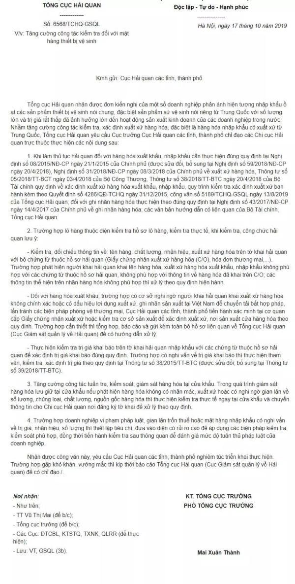 越南海关总署在文件中指出,收到了许多企业的书信,反映出一般情况下大量进口卫生洁具产品,特别是从中国进口的卫生洁具产品,影响了越南本地企业的生产和经营活动。为避免这种情况,越南海关总署要求各省市海关部门的主管在执行进出口货物海关程序时指示其海关分部门遵守有关商品原产地和商品标签的法律规定。
