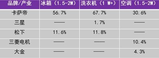 终端的消费形势特点凸显了家电行业一个很明显的趋势:高端用户更倾向于一站式成套家电消费,而家电之间能实现主动互联的品牌也更被用户欢迎。从最新发布的数据上可以看出,几大品牌的高端份额也在稳步上升,其中成套家电是消费主力。冰箱方面,43周卡萨帝1.5万-2万产品份额达56.7%,第二名份额是7.3%;洗衣机方面,42周万元以上卡萨帝份额为67.7%,松下为11.8%,三星占1.7%;空调方面,1.5-2W价格段卡萨帝份额为30.6%,三菱电机10.4%,大金4.3%。