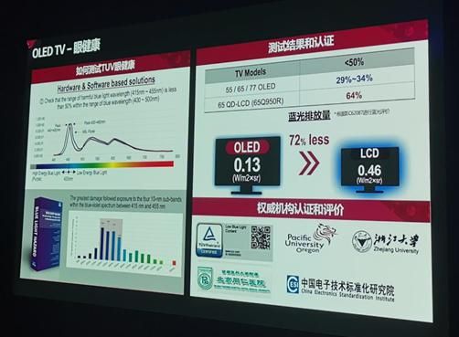 除了画质更好,OLED还更加护眼健康。这是因为相比需要依靠背光源照射发光的液晶电视,OLED屏幕没有背光源,所以有效降低了有害蓝光的排放量,其有害蓝光排放比液晶电视少了72%。很多国内外的认证机构也证实了OLED在眼健康方面的优势。例如:美国太平洋大学、中国浙江大学、北京同仁医院以及中国电子技术标准化研究所的相关认证。而德国权威机构TUV更是从画质、蓝光、闪烁、反射光等四方面证实了OLED电视对眼健康更有优势,所以消费者在选购电视的时候,可以放心的选购蓝光少的OLED电视。