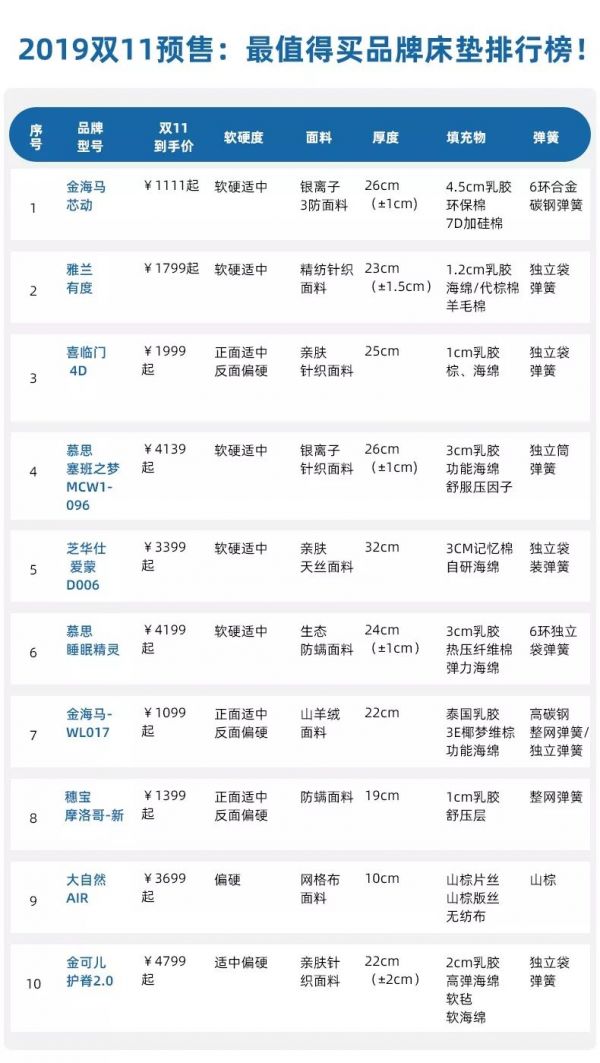 同时特地将前10的床垫参数罗列出来,相信大家看完,就知道该入手哪一款了~