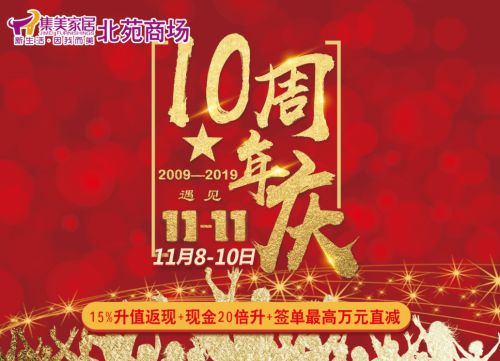 11月8日至10日,集美家居北苑商场迎来十周年店庆,同时,随着“双11”购物节的到来,商场将钜惠献礼,回馈广大消费者。